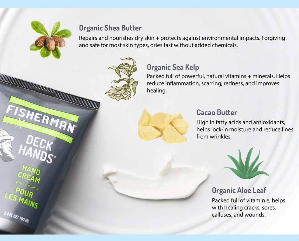 Deck Hands provides focused therapy that will penetrate your skin and provide sustained relief. This fast absorbing cream will protect your hands from the harshest conditions.. relieving cracks, sores, and calluses from dry skin. Take care of the best tools you own.. your hands! Made with Organic Shea, Local Nova Scotia Juniper and Nova Scotia Sea Kelp.