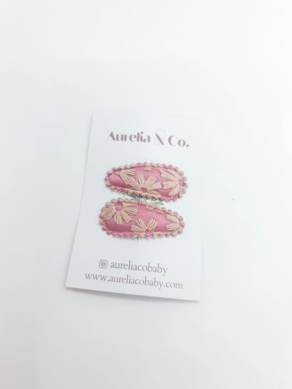 Discover Aurelia & Co. Baby's Mini Embroidered Barrettes, perfect for babies with fine hair. This set of 2, 3cm barrette snap clips are not just adorable but also environmentally conscious, crafted to be fully recyclable. Ideal for baby showers, these barrettes form a core part of our kids' hair accessories range. Quality assured from a mama-owned company based on the beautiful Vancouver Island.