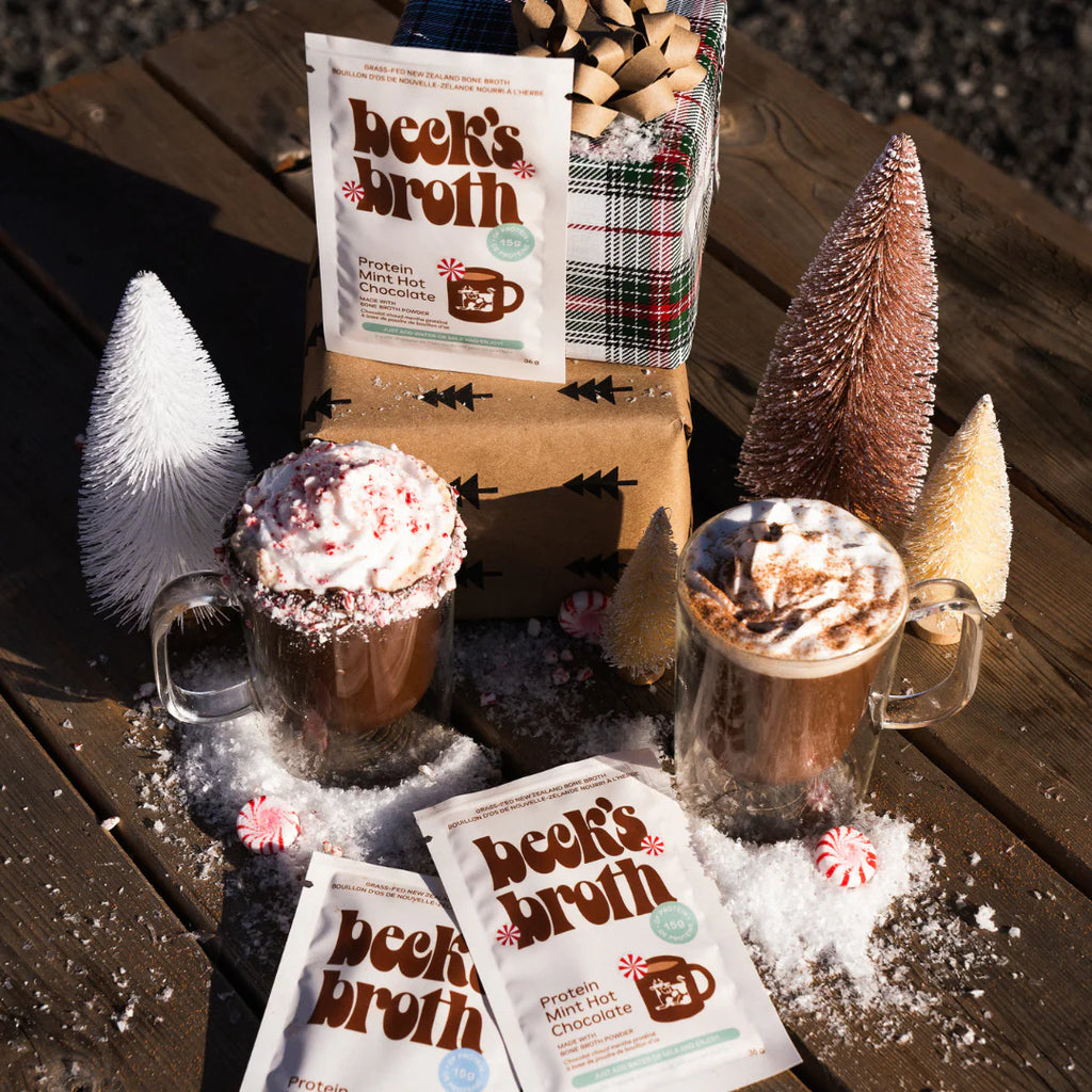 Beck's Mint Hot Chocolate blends rich cacao with a refreshing hint of mint for a feel-good treat that’s anything but ordinary. With 15g of protein and gut-nourishing bone broth in every cup, it’s here to satisfy your late night mint-choco cravings and support your digestion, one decadent sip at a time.