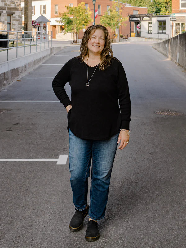Meet your new go-to sweater! Designed for ultimate comfort, this waffle knit sweater feels like a warm hug and is the perfect blend of lounge and laid back style. It has a relaxed fit and elevated details (of course!) Raglan sleeves, a V-neck, side slits just like Blondie's best selling Dusk Sweater, and a high-low hemline. Whether you're unwinding at home or heading out for a casual day, this cozy essential will be your everyday favourite.